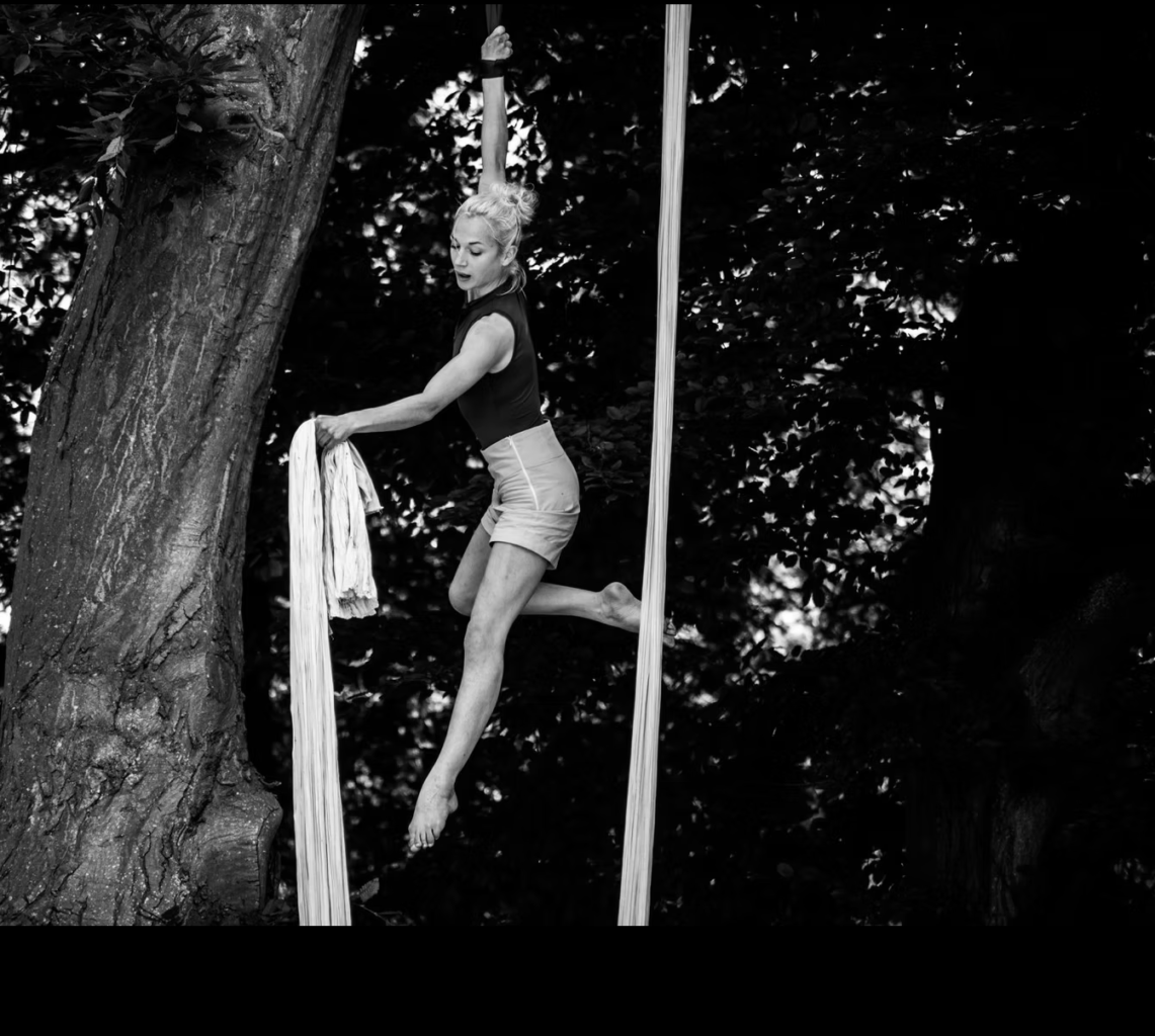 Performance aérienne et musicale conçue pour l'extérieur (milieu naturel ou urbain), et pour l'intérieur (plateaux de théâtres, lieux insolites, ... ).Faire une pause, ici et maintenant. Regarder lentement. Ecouter doucement. Ramener notre imaginaire à la simple sensation d'être là. Elle accrochée là-haut, lui accordant son tempo. (Se) suspendre, pour s'enraciner. Un arrêt qui apaise, et laisse champ libre aux forces qui traversent le corps.